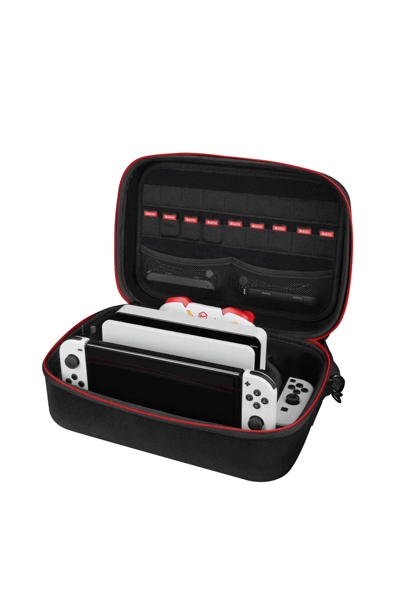 The Powerwave Switch Deluxe Console Carry Case fits an AC Adapter, Joy-Con Straps, HDMI Cable, Pro Controller, 18 Game Cartridges, Joy-Con Grip, Joy-Con (L & R), Nintendo Switch Console & Nintendo Switch Dock.